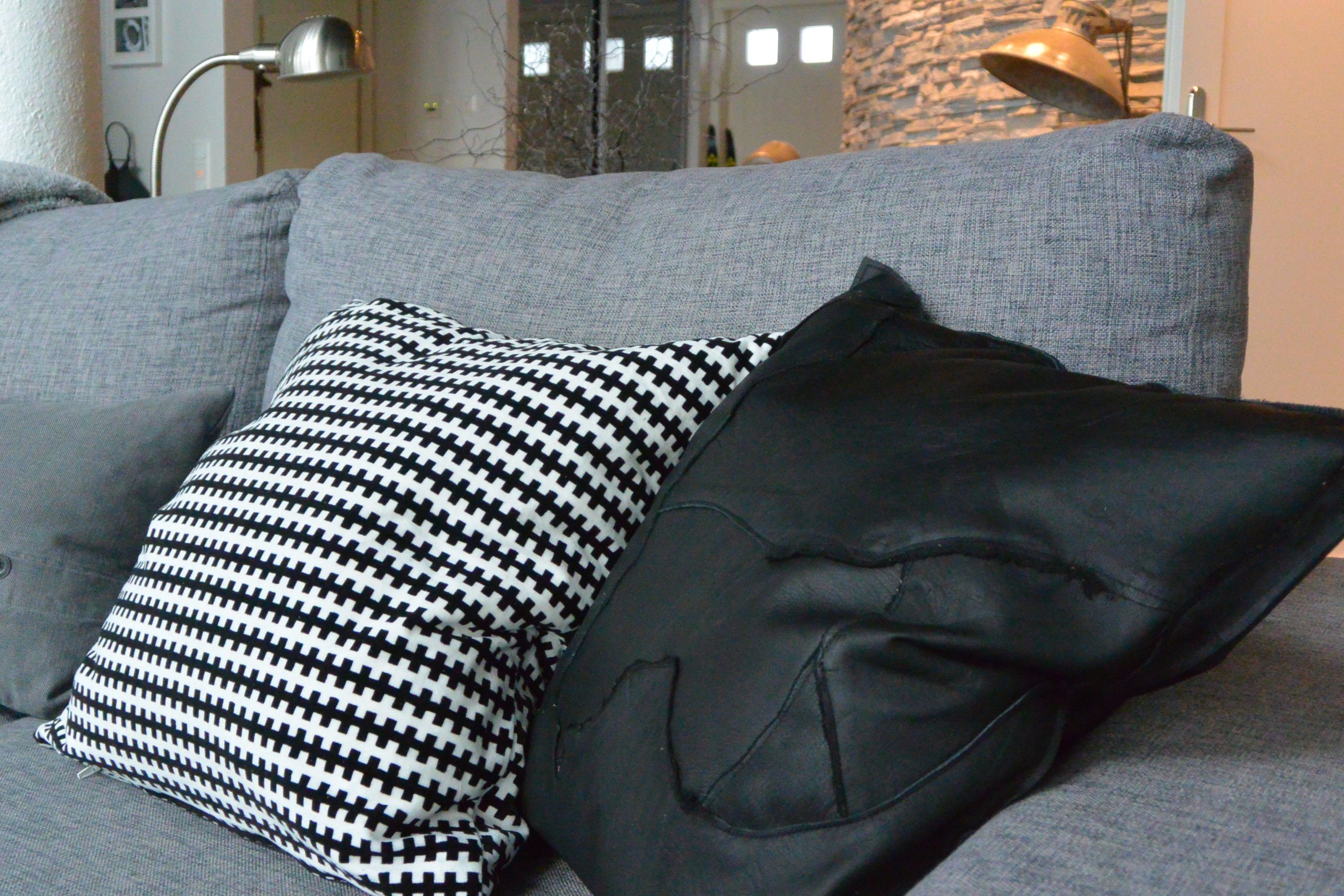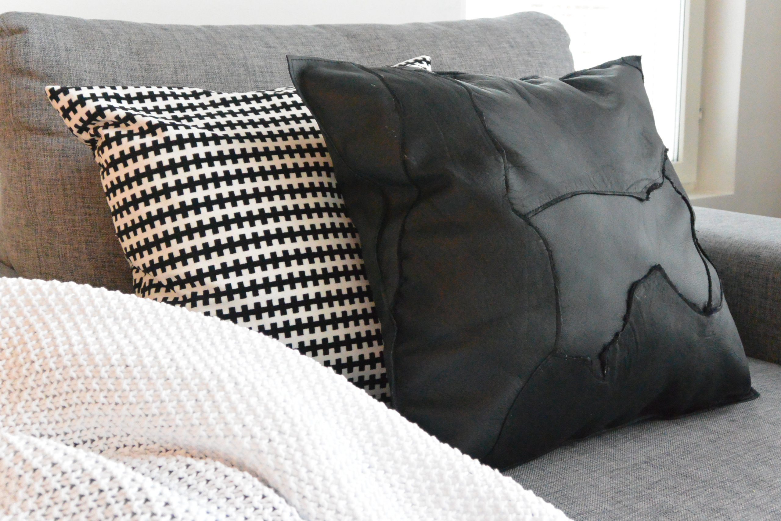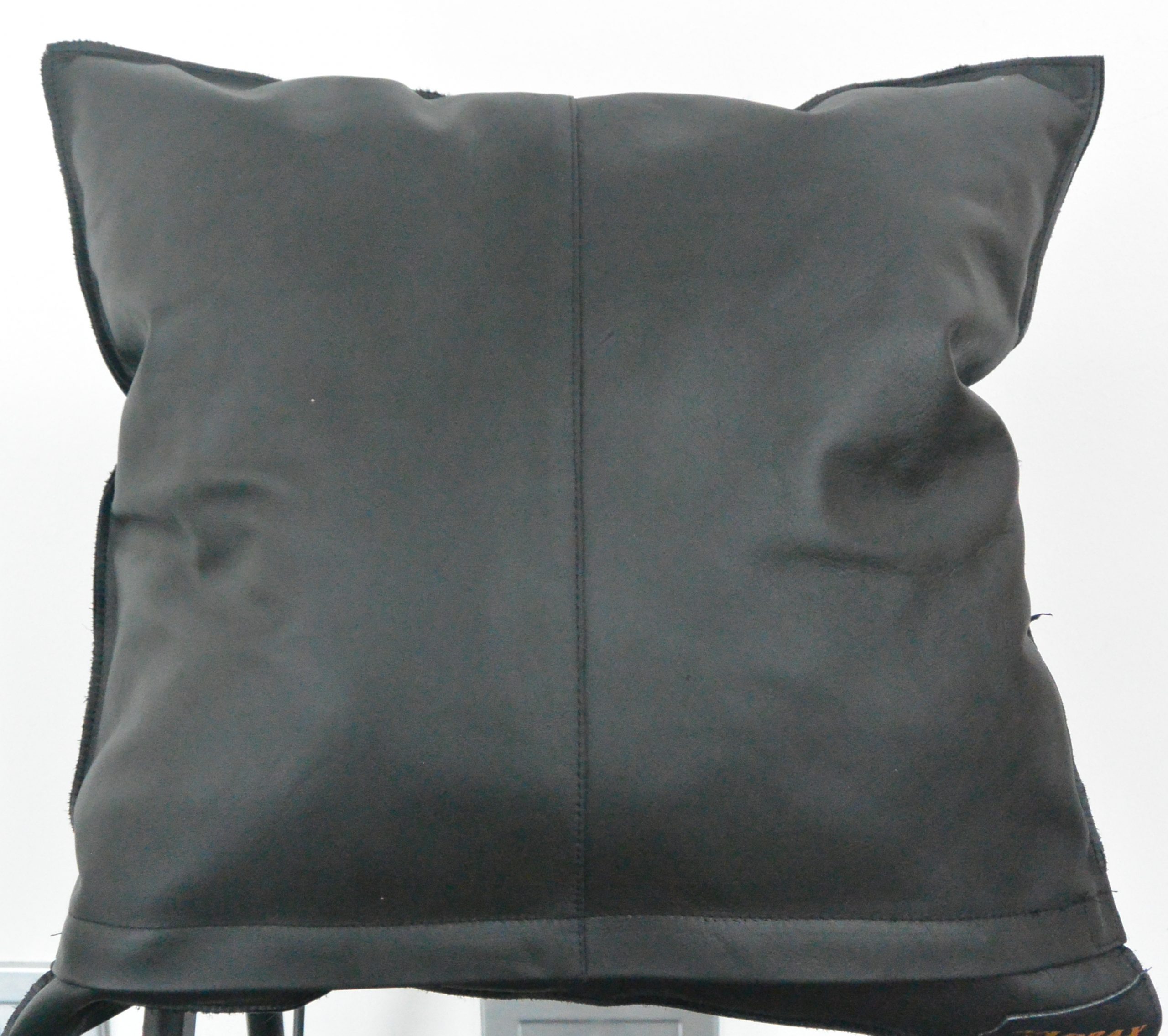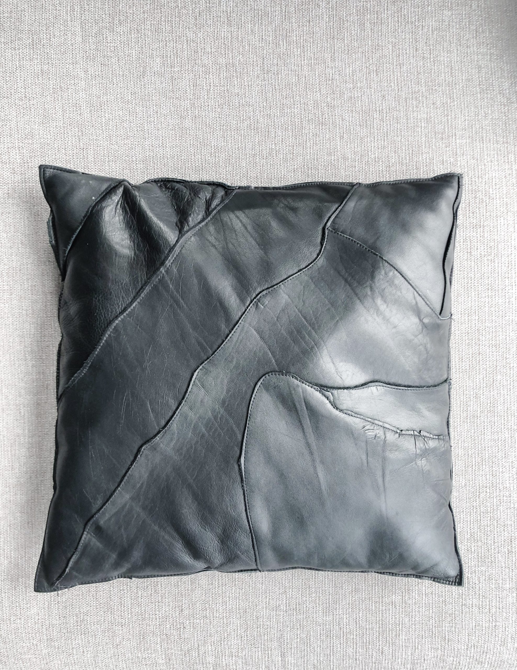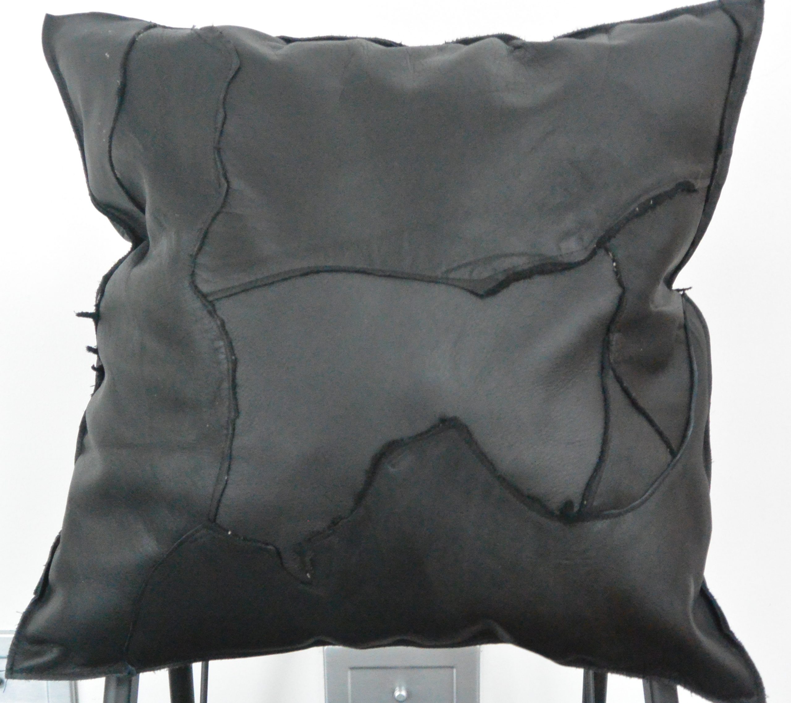 Kuvan nahka: musta läpivärjätty. Sallitut nahan pintavirheet lisäävät asiaankuuluvaa rouheutta. Jokainen tilkkutyyny on erilainen leikkauksiltaan ja paloiltaan. Katso kaikki kuvat.