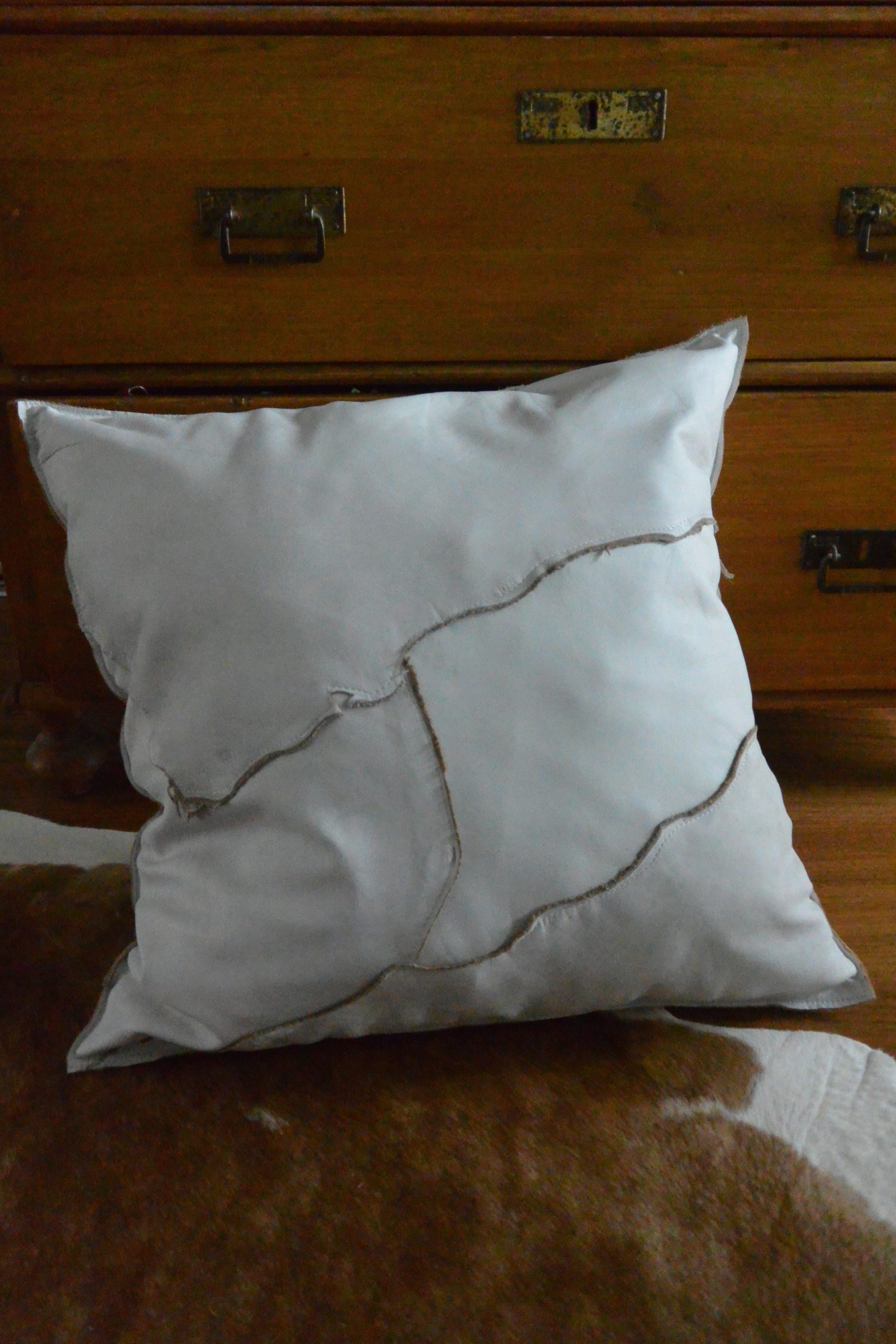 Ainutlaatuinen, näyttävä, nahanpaloista ommeltu nahkatyyny. Tällä tyynyllä luot rentoutta ja rouheutta sisustukseen hetkessä! Tyynyn koko n. 50×50 cm. Vetoketju takana. Ei vuorta (huom. nahan sisäpinnasta irtoaa nahkanukkaa sisätäytteeseen.) Tuote ei sisällä täytettä.